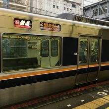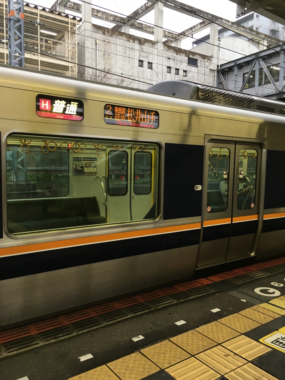 ほとんどの電車が松井山手行きになっています。電車のクッションは新しい電車ほど薄いので、長時間のっているとお尻がやや痛くなります…大阪駅ではなく、北新地駅を通過する大阪駅を通らない数少ない電車なので、ラッシュ時でも神戸方面に抜ける時に比較的空いています。