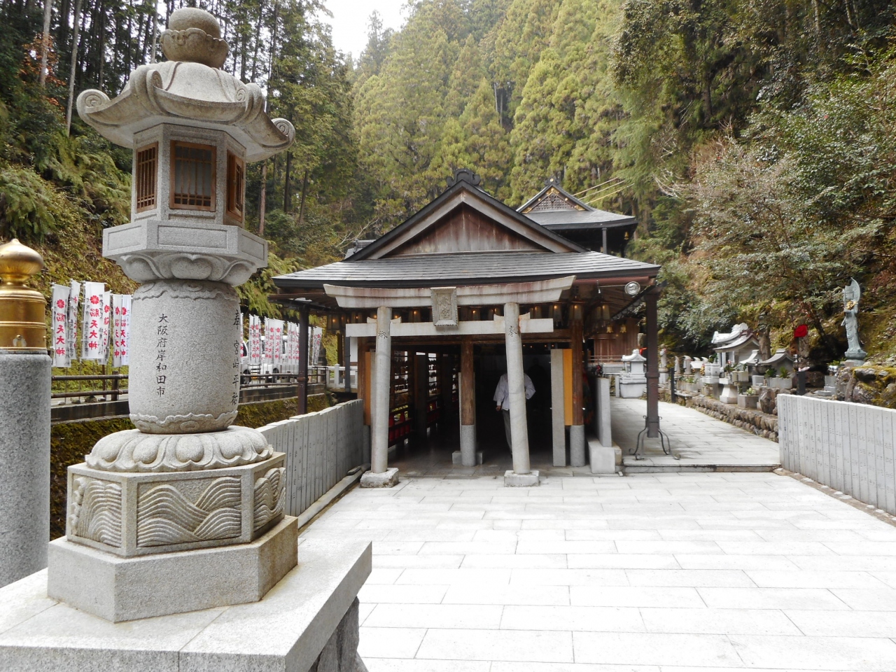 金峯山寺の蔵王堂から約450段の石段を下りていったところにある神社。頭を割られた大蛇を祀っていて、首から上の病気に霊験あらたかと言われている。