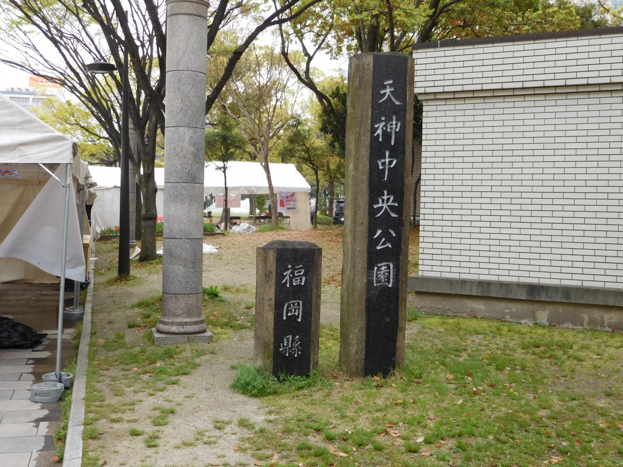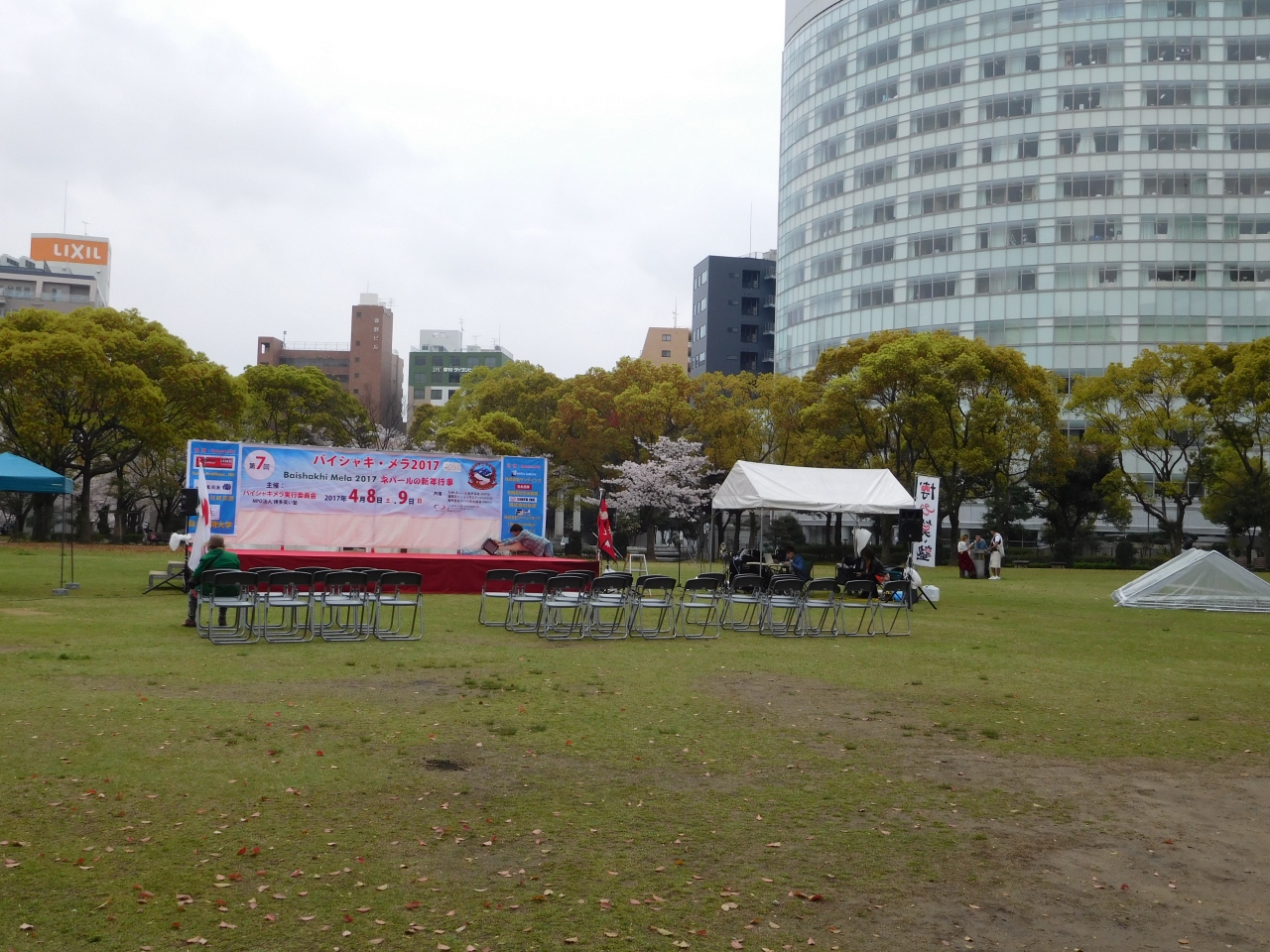 福岡市役所の向かい側にある、総面積が3万平方メートル以上もある、広々とした公園です。近くを通りがかると、イベントブースなどが並んでいて、ネパールの新年行事である催し物が開催されているようでした。芝生エリアを取り囲むように、桜も咲いていて、お花見を楽しみながら、イベントも楽しめるような感じでした。