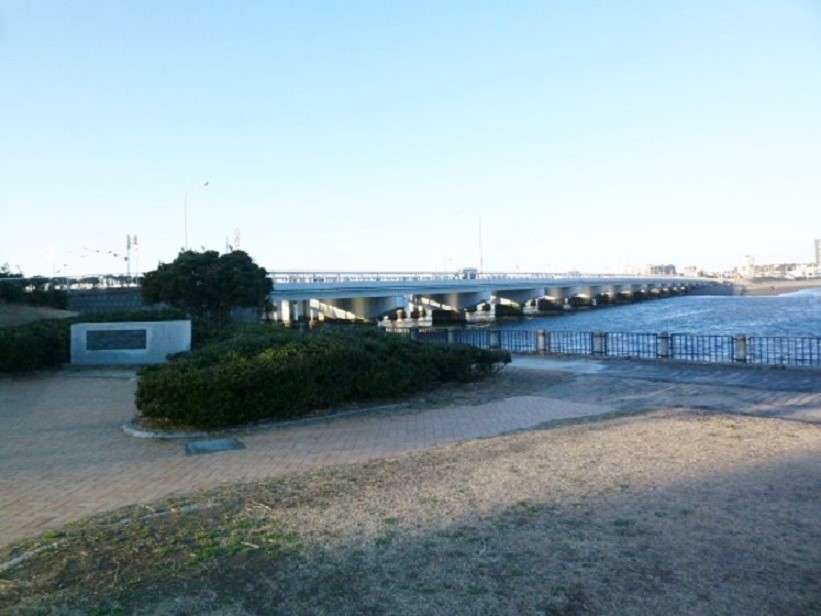 大橋を渡って駐車場の方向に行くようになりますので分かり難いかもしれませんが写真が記念碑です。人影も少ないです。