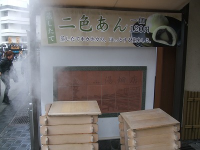 湯畑前の店頭で、蒸籠から蒸気が上がっていて、ついお店に引き込まれてしまいます。出来たての温泉饅頭が食べられるのが何よりうれしいです。