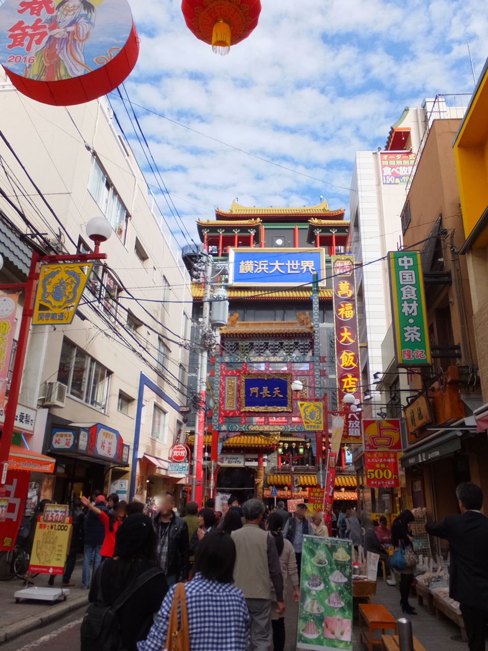 中華街通りの南に平行する関帝廟通りの両端の門(天長門と地久門)はそっくりさん。この東の入口の天長門は中華街の門では珍しく行き止まりの三叉路にあるので引きがなく狭苦しい場所に立っている印象です。また横浜大世界の正面ということで門の小さいのが目立ってしまって、ちょっとその点ではさみしく感じます。