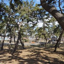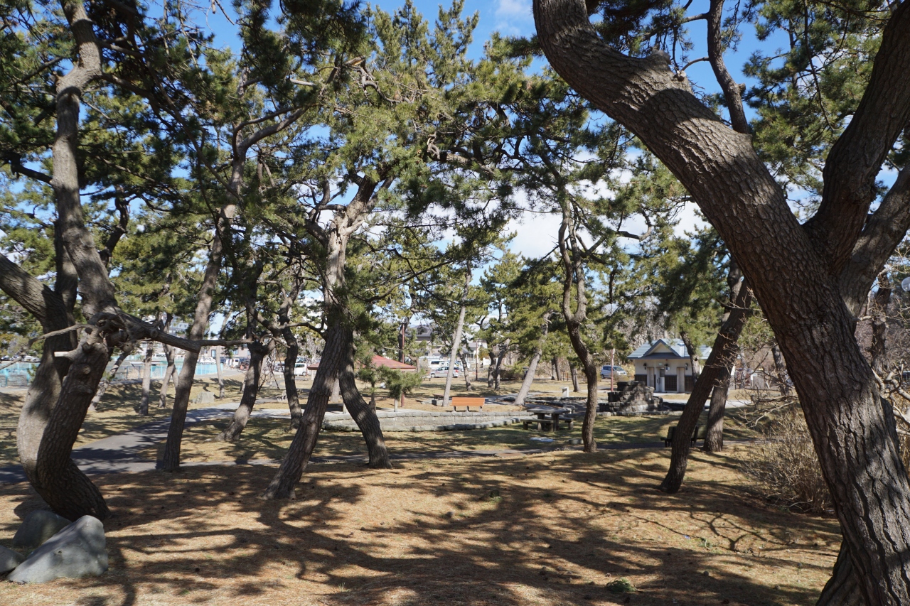 湯浜公園は、湯の川温泉市街。海岸にも近い松倉川に面した場所。砂地に植えられた防風林みたいな松の林に覆われた公園でのどかな感じ。周囲には大きなホテルも建ちますが、ただ、周辺のそぞろ歩きのコースになっているのかどうか。わざわざ行くほどのこともないように思います。