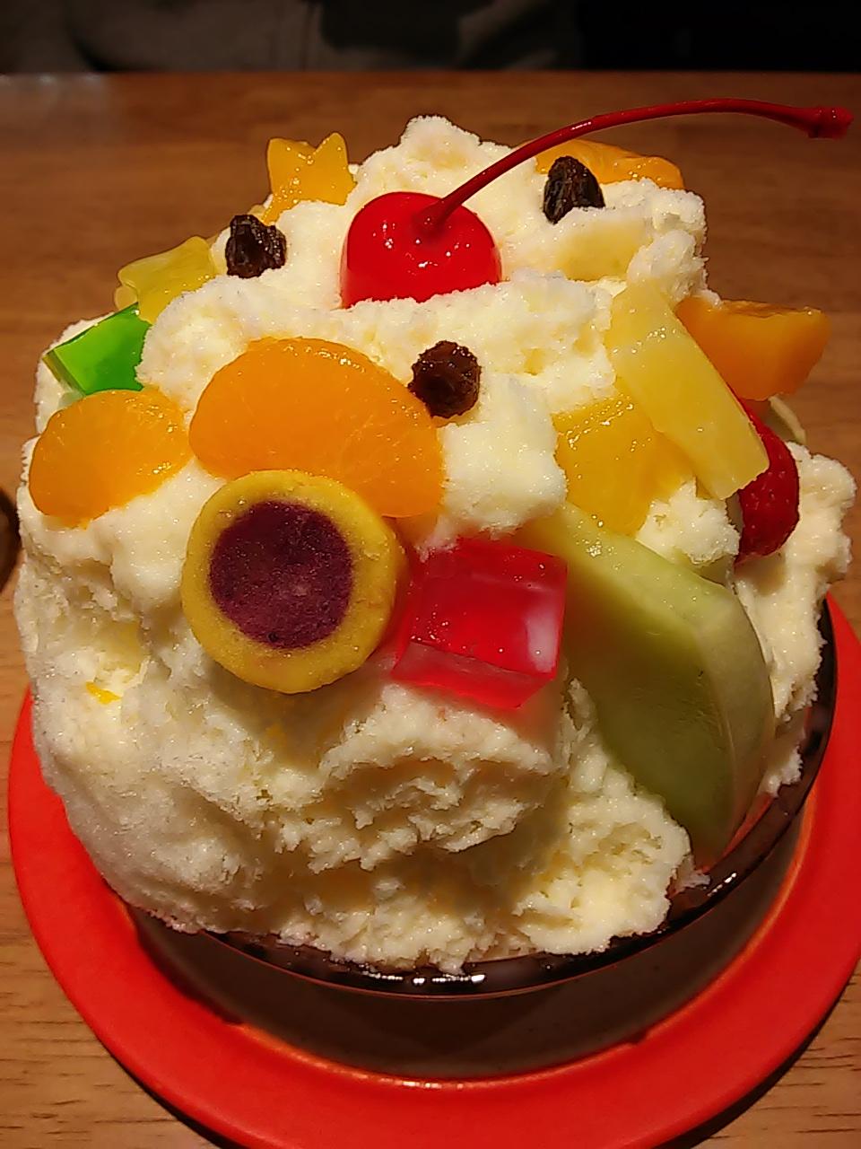 老舗だと聞いていたので、古びた昭和風情の佇まいを勝手に想像していたのですが。全然、イマドキな感じの明るいカフェでした。入口の大きな(等身大?)白熊が目印。オーダーするのはもちろん「白熊」。ミニサイズもあるのですが、普通サイズだとふたりでシェアしてもOKだそうです。とか言いながら、夫と私でひとつづつしっかり食べましたが(笑)。きめ細やかなかき氷は、意外にしっかりガリガリ食感。お約束の練乳がた~~~っぷりで幸せでした。トッピングのフルーツは季節によって変わるとかいてありましたが、さくらんぼ、缶詰のみかんやパインなどはやっぱり鉄板。練乳は思ったより上品であっさりしてたけど、本場の白熊が味わえてとても満足。