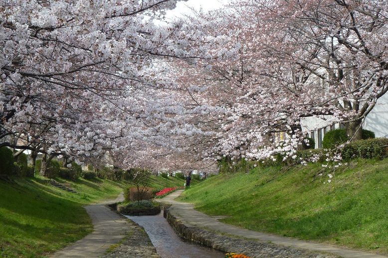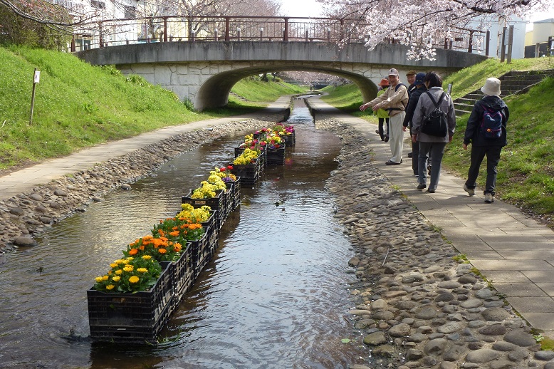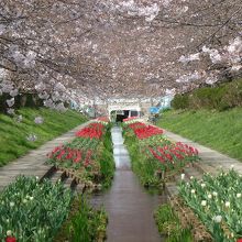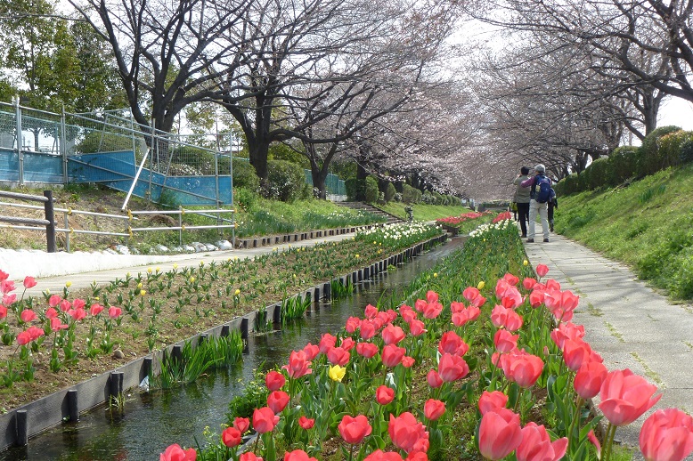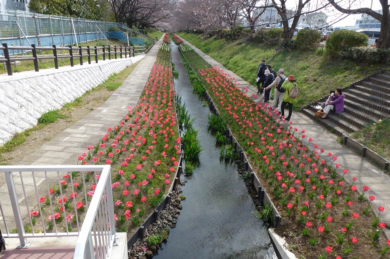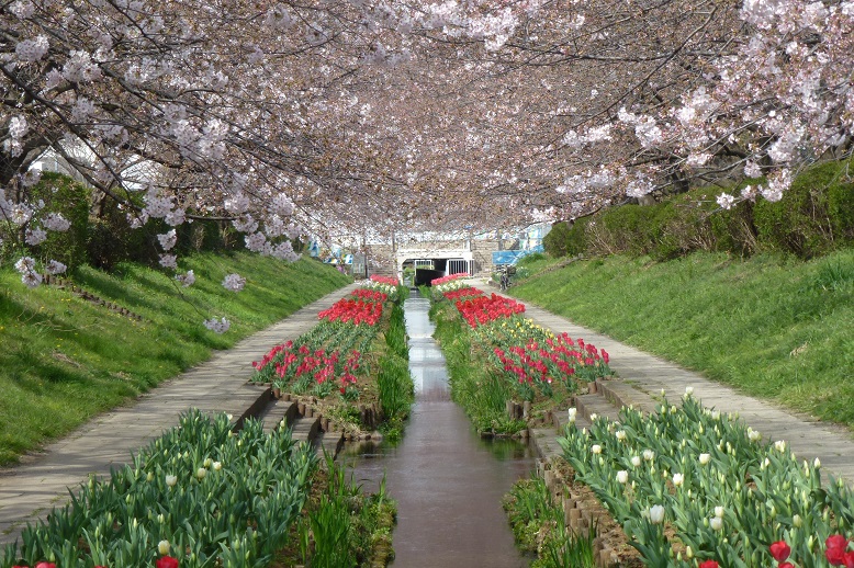 江川は、もとは東方町と川向町の境を流れる農業用水でした。都市化が進み、農業用水の役目を終えて荒廃していたところを、都築水再生センターの高度処理水を流して整備し、鮒や鯉が泳ぐ水路となり、桜やチューリップが植えられ「花の名所」になっています。