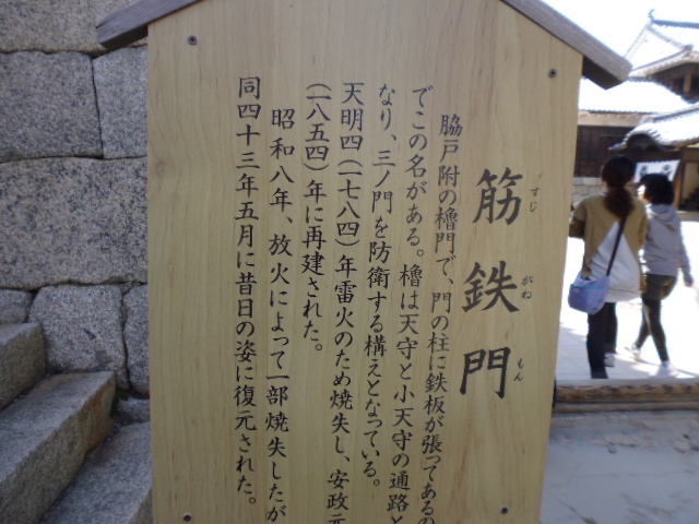 すじがねと読む筋鉄門は、天守閣玄関である中庭を防御する重要な門ということです。本丸の本壇の中にある門で、ここまでもし敵が来たらもう最後というあたりの門です。