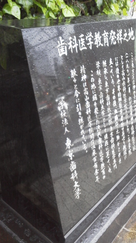 高輪~三田を歩いている途中に、信号待ちをしていてふと脇を見たらひっそりと碑がありました。あんまり目立たなくて他の人は誰も見ていませんでしたが、いろいろと書いてあるので読んでみると、明治時代にここから歯科医学教育がはじまったそうです。