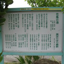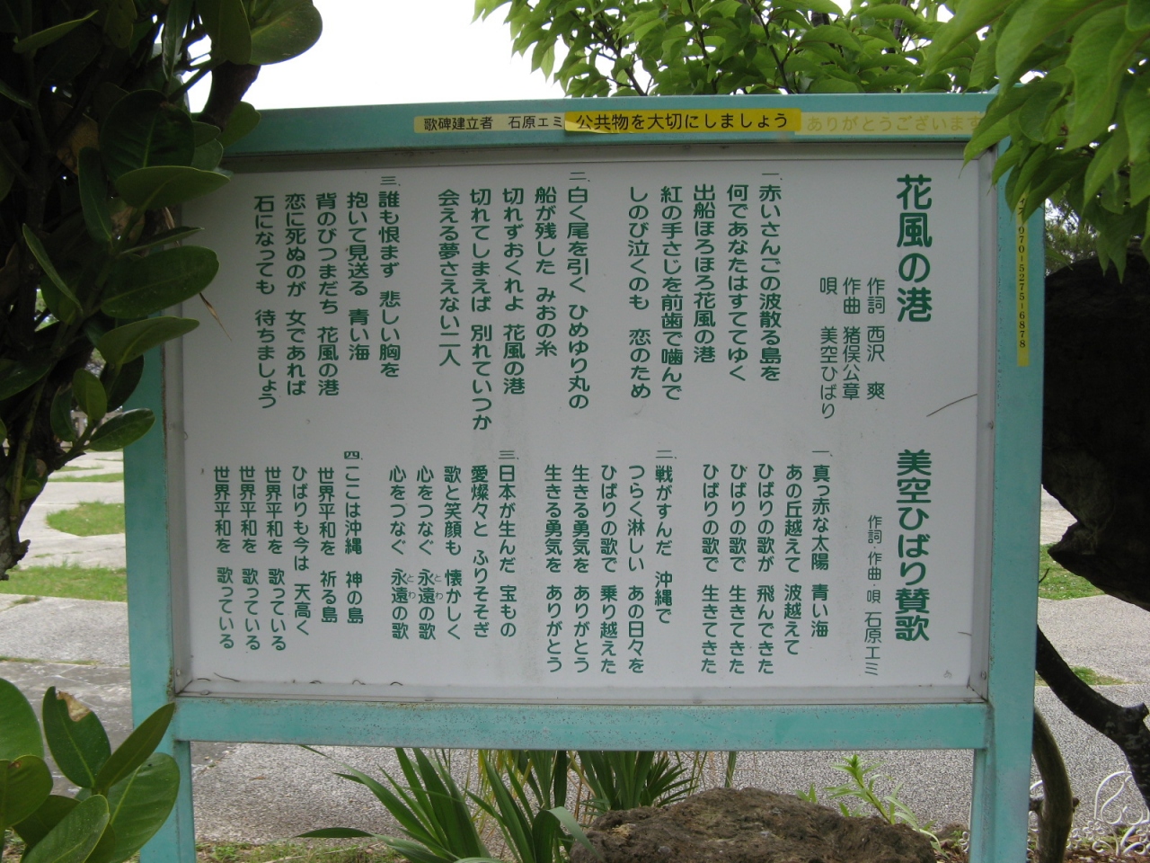 ゆいレールの小禄駅から歩いて10分ほど、がじゃんびら公園の西北端に幾何学的模様のある広場があり、その一角に美空ひばりさんの“花風の港 歌碑”があります。その前に立つと美空ひばりが歌う“花風の港”が自動的に流れてきます。歌碑の裏側、草木に囲まれて少し判りずらい位置ですが“花風の港”と“美空ひばり賛歌”の歌詞が記された表示板があります。駐車場がなく、アクセスが不便ですが美空ひばりファンの方にオススメします。