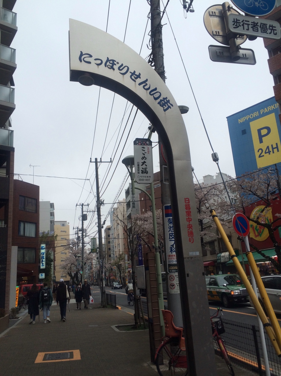 日暮里駅東口、ロータリーの右斜め道を突き進み始まるにっぽり繊維街