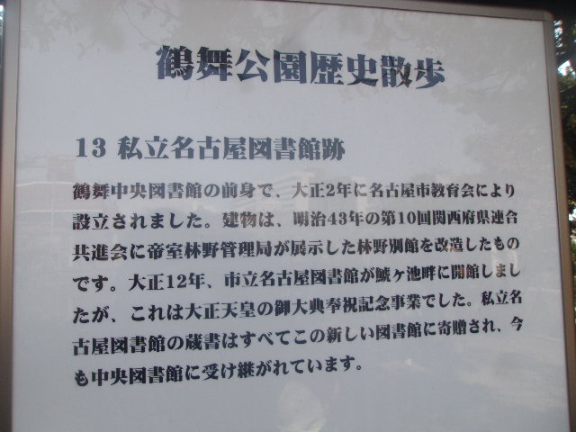 名古屋を代表する巨大図書館で、鶴舞公園内にあってJR・地下鉄駅からも近いので、市民を中心に利用頻度の高い図書館です。館内には名古屋のB級ファストフードとして有名なスガキヤの店舗まであります。私は今回は月曜日の訪問でしたので生憎の休館日でしたが、ここは観光という視点で見た場合、同じ鶴舞公園内の全く別の場所に、元々の私立図書館が設置されていた跡地があって、そこに解説板も設置されていますので、現在の図書館がここに設置された意味を考える上でも、是非立ち寄ってみて下さい。
