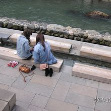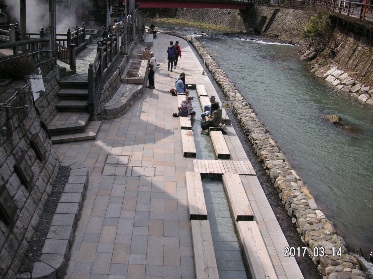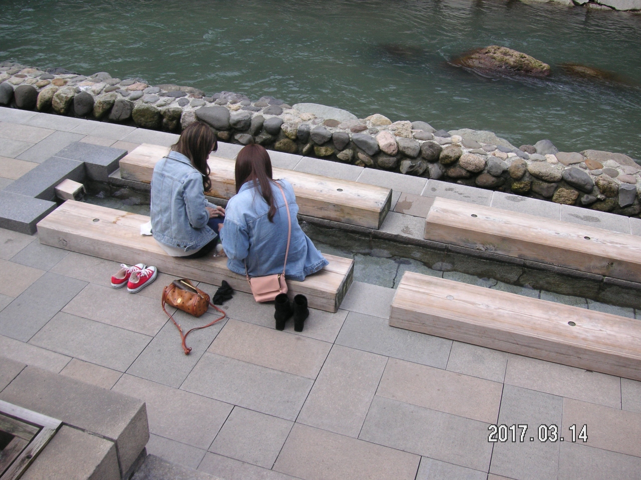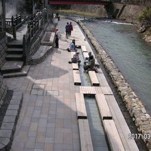 湯村温泉に立ち寄ったときには必ず利用するのが、春木川、荒湯の横に併設している無料の足湯場所。木材の長椅子に腰を掛け、温泉卵を食べながらのひと時は、疲れた足の癒しになりました。足ふきのタオルを持参することをお勧め。いつでも無料で利用できるのが魅力です。