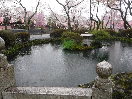 生憎の雨で富士山は全く見えませんでしたが、桜は満開で、朱塗りの大きな社殿や木々、涌玉池など色鮮やかでとても綺麗でした。雨のせいか人も少なく、落ち着いて過ごすことができました。