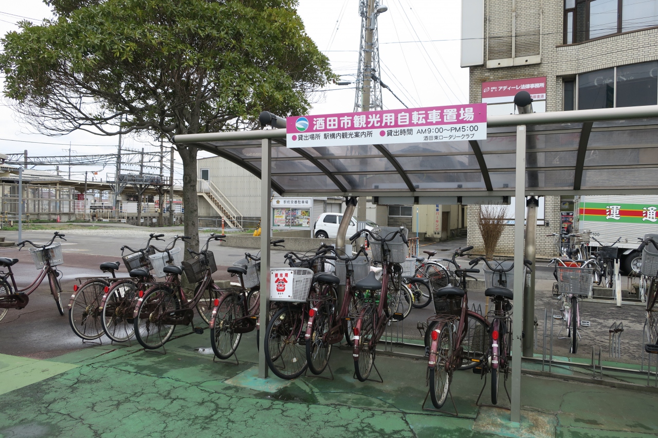 酒田駅の観光案内所で手続きをすると,無料のレンタサイクルを借りることができます.