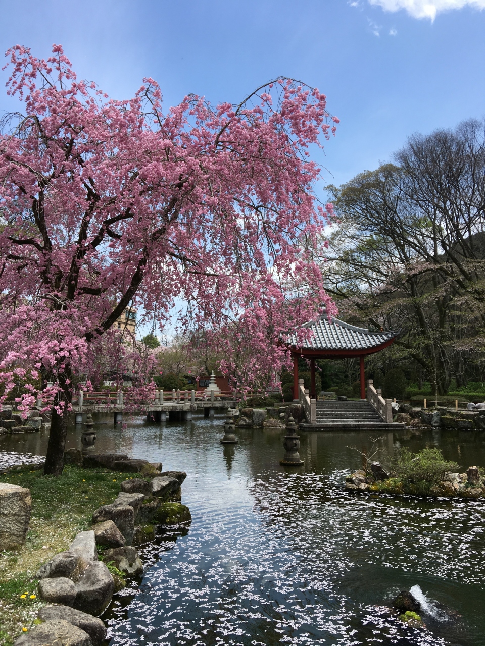 中国風の庭園があり友好都市の中国・杭州市の名所・西湖を模した池が中央に造られています しだれ桜がとてもきれいでした。