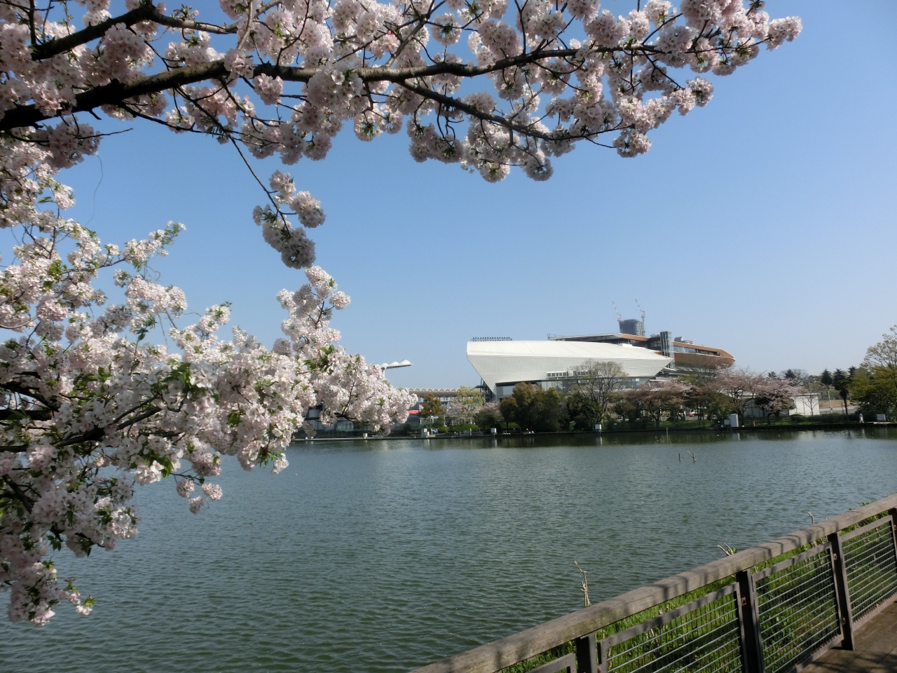 池の畔から、ちょうど満開のサクラ越しに見た競技場は絶景だった。