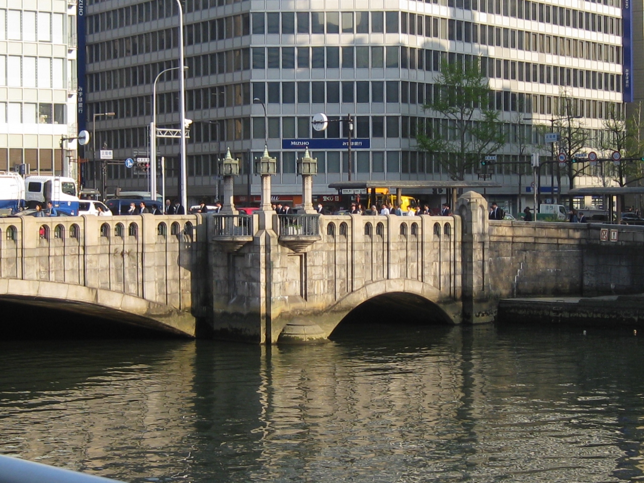 大阪の大動脈北から南に走る御堂筋(国道25号)の中之島と北浜を結ぶ土佐堀川に架かる大橋で周辺の地名にもなっています。中之島側に大阪市役所、日銀大阪支店、船場側には日本生命本社、住友村があり代表的なオフィス街となっています。江戸時代豪商淀屋が米市の利便の為架橋したのが由来だそうです。浪速名橋50選にも選ばれ、また国の重要文化財にも指定されています。橋の北側中之島にはレトロな建築物があり周辺を散策すると感動します。