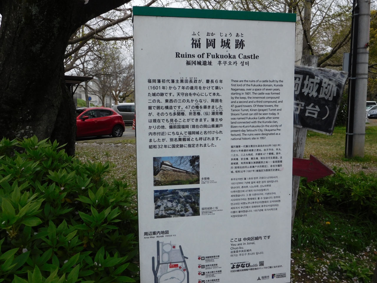 舞鶴公園内に福岡城跡があります。現在は天守閣は残っていませんが、櫓の一部と石垣などを見る事が出来ます。ちょうど、さくらまつり開催の時期に訪れたので、天守台からは、公園内に咲く見事な桜の景色を見る事が出来ました。さくらまつり期間中は、歴史的建造物公開を行っている場所がいくつかあり、無料で内部を見学する事も出来ました。「(伝)潮見櫓」、「下之橋御門」、「旧母里太兵衛邸長屋門」の3か所、見学する事が出来ました。結構、見所が多かったです。