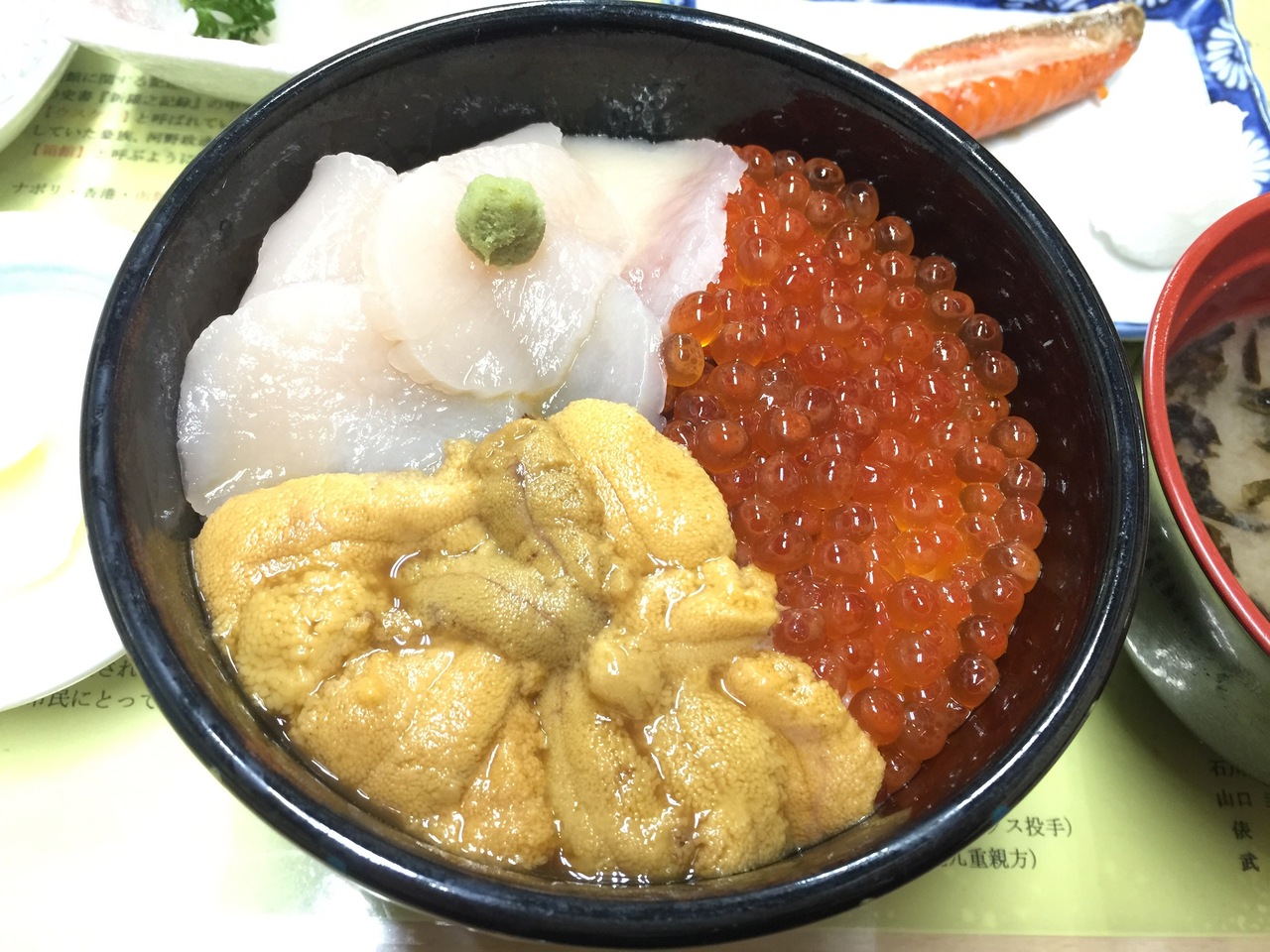 ウニイクラホタテの丼と、鮭腹身焼いたのとイカそうめんの定食。