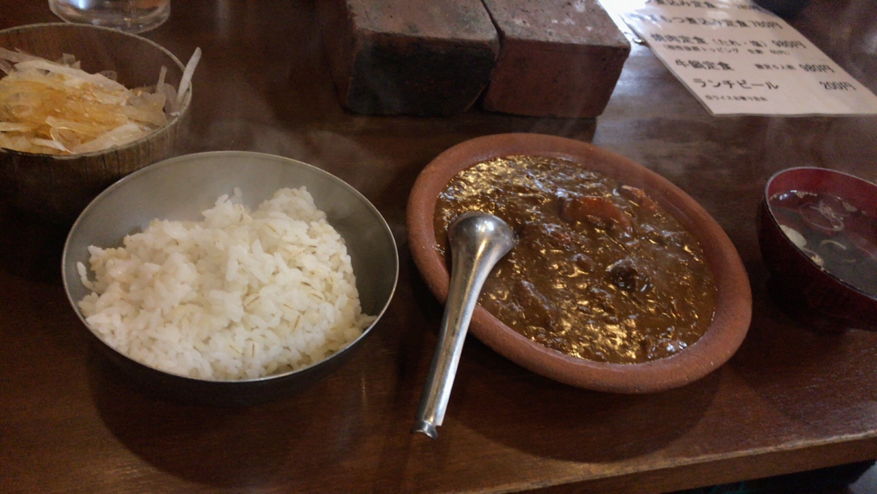 最初に玉ねぎのサラダのようなものが出てきて、そのあとスープ、ライス、牛すじ煮込みと運ばれてきました。