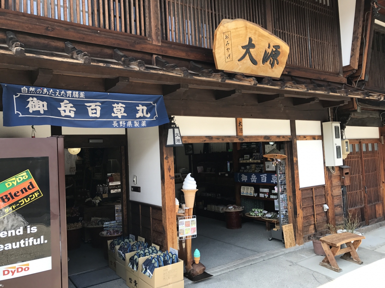 奈良井宿のちょうど真ん中あたりにある土産店。土産店ではありますが、腰かけるスペースがあってちょっと休憩できるのがうれしかったです。奈良井宿の民芸品、草履なんかはユニークでしたが、御岳百草丸など地元の土産が充実していました。
