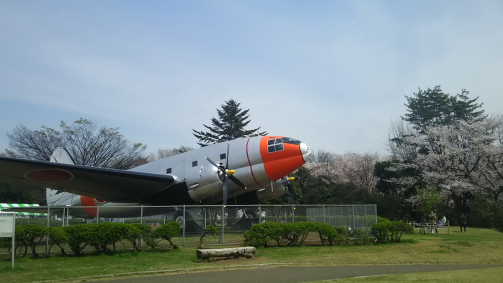 この公園は、1911年に日本初の航空機専用飛行場がこの地に造られたことを記念し、その一画を公園として整備したとのことです。今回は花見を主目的に訪れましたが、園内には所沢航空発祥記念館のほか、2機の実機が展示されています。航空公園駅前にはYS-11、園内中央近くには「航空発祥の地」記念碑の隣に、昭和30年から航空自衛隊に導入(アメリカからの供与)されたC-46輸送機(アメリカのカーチス・ライト社製)が展示されています。このC-46は1940年の初飛行だそうですから、懐かしい映画に登場してくる様な如何にも鈍重そうな機体をしています。製造メーカーでの愛称は時代背景らしく勇ましい「コマンドー(Commando=奇襲隊)」でしたが、日本での愛称は「天馬」だったとのことです。なお、機内の公開はされていない様です。