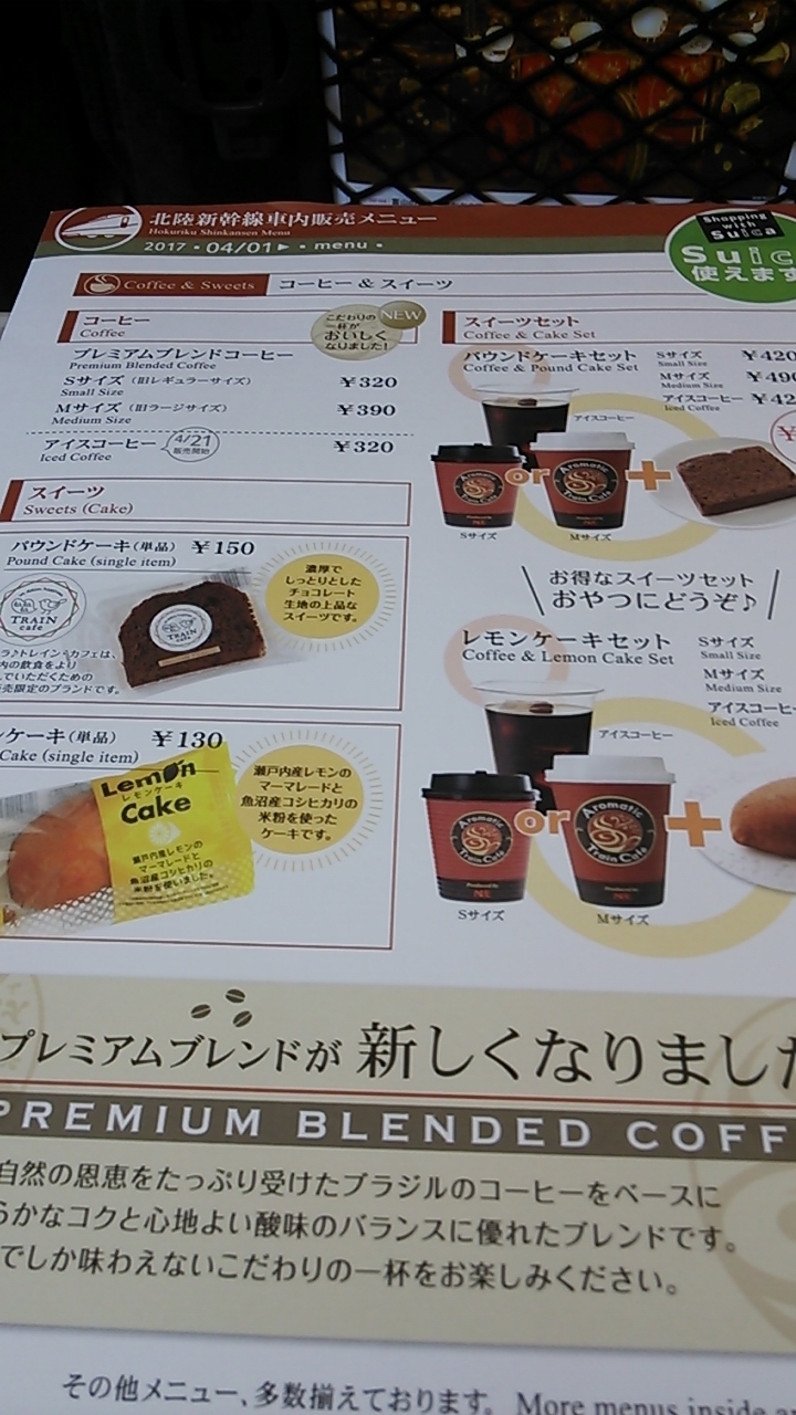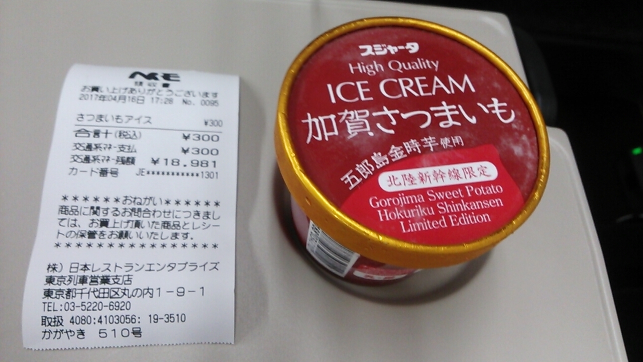 2017年4月16日の日曜日に利用したところ、車内販売で加賀金時芋を使用したさつまいもアイスクリームの販売がありました。