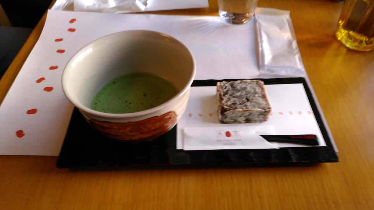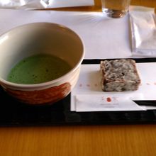 私たちはきんつばと抹茶のセットを選びましたが(540円だったと思います)、コーヒーの組み合わせもありました。