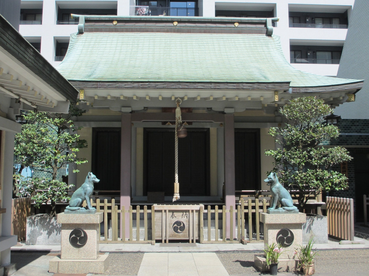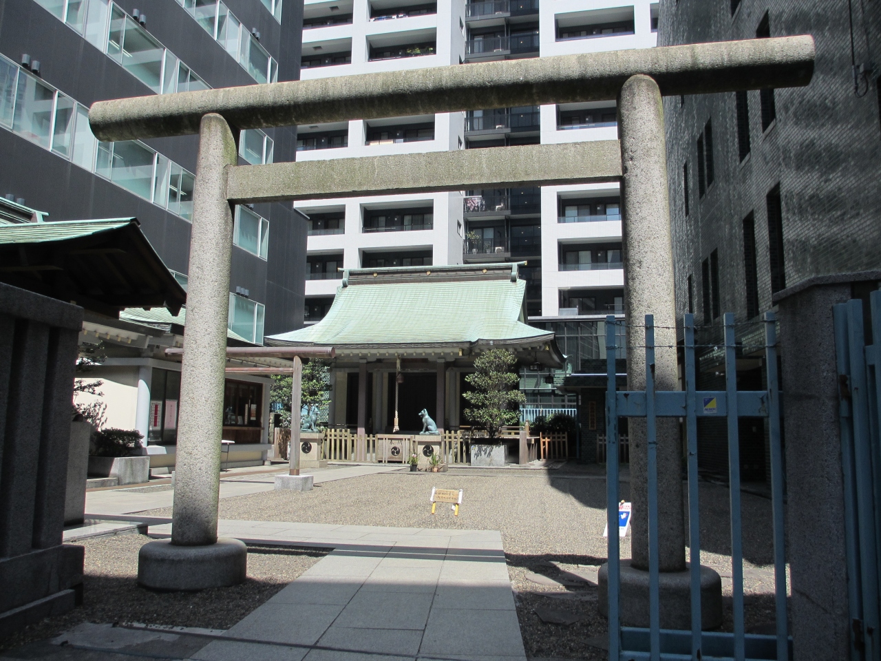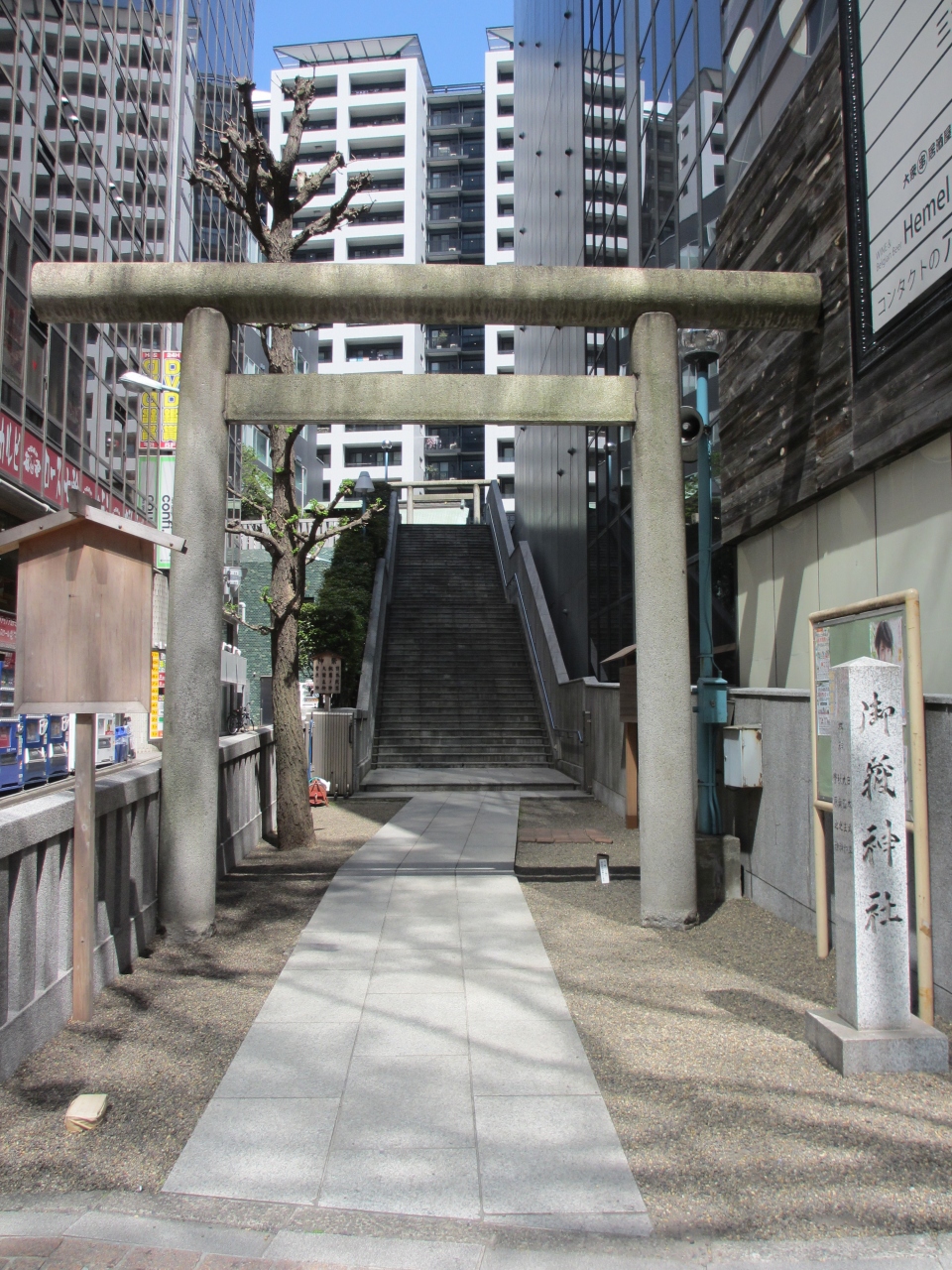 宮益坂に鳥居が面して立っています。そこからビルの2階分くらい石段を上がると鳥居があり拝殿があります。明治天皇が休憩された記念碑や宮益不動尊が境内にあります。他に菊の紋が彫られた手水台のような石が脇にありました。ビルやマンションに囲まれ、神社はビルの一部三階にあるので訪れる人はいませんでした。由緒ある神社でもにぎやかな宮益坂にあるので寂れた感じがしました。宮益坂を歩く際に寄る程度でいいと思います。