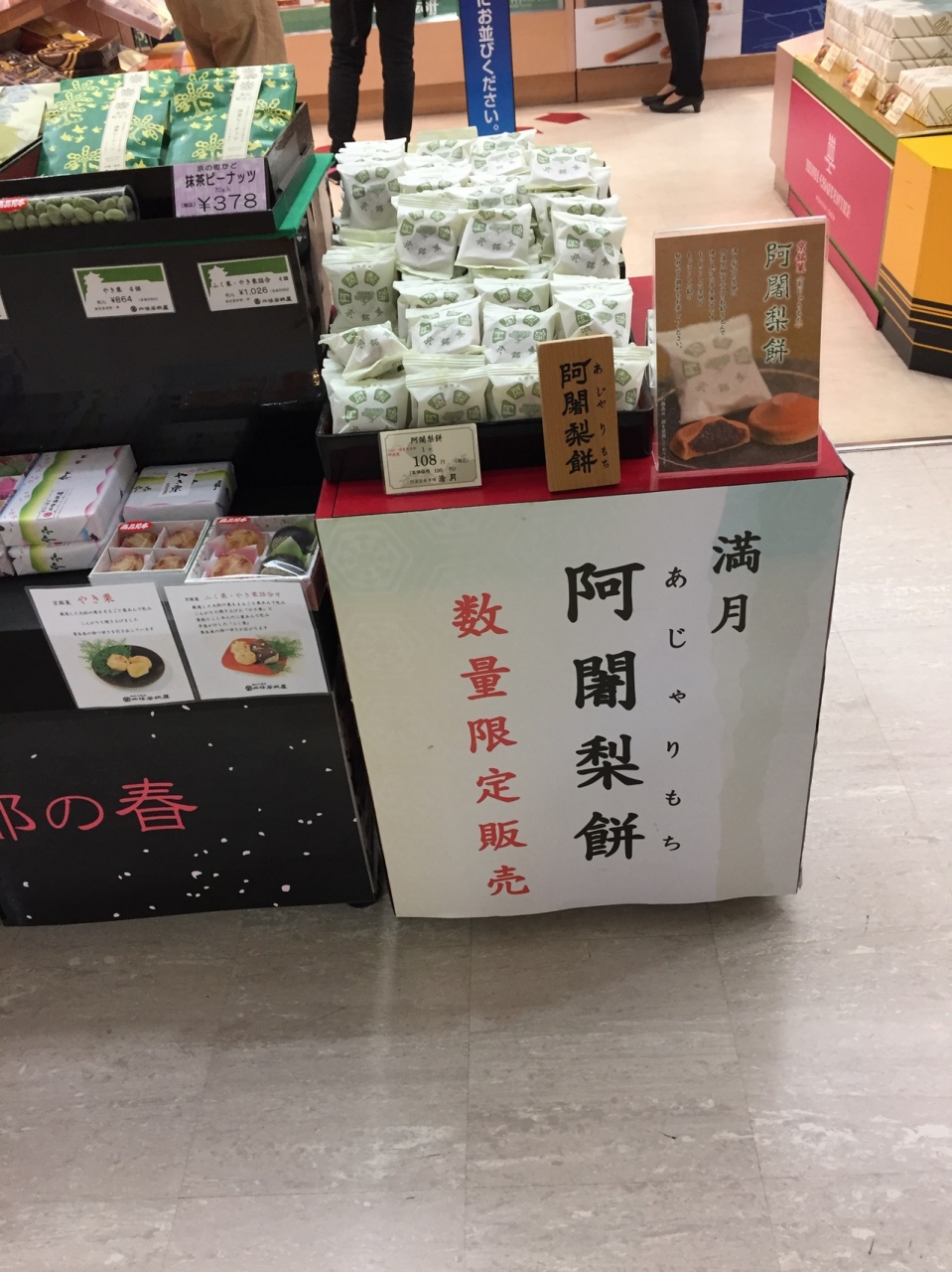 チェックインして、手荷物検査場の前にお土産を買うなら、このスカイプラザでまとめることをお勧めする。期間限定で阿闍梨餅が!さらに数量限定なのだ。阿闍梨餅は見た目は大判焼きを小さくしたよう。でも、餡のレベルが高い。周りの餅がモッチリ。こちらは機内のデザートにします。