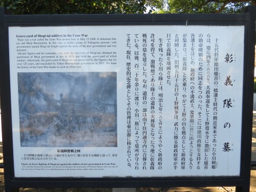 彰義隊戦士之墓は、上野公園内にあります。この場所は、上野戦争時に戦場になっただけではなく、戦死した隊士の火葬場にもなったため、このお墓が造られました。たくさんの人でにぎわう上野公園ですが、足を止める人も少なく、在りし日を偲びながら見学できました。