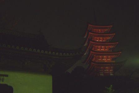 フェリーを降りて海沿いを歩き、海に浮かぶ鳥居を眺めて参道を廻り込んで厳島神社社殿を右手に見ながら歩いていると、左手奥にライトアップされている塔が目に入って来ました。浅草寺の夜の五重塔なら強烈な圧迫感を覚えるところですが、宮島の五重塔のライトアップはなんともぼんやりしていて、その朱色が闇に半分溶けており、知らずに畏怖の念すら湧いてきます。入場できるわけではないようですし、そんな次第で、眺めるなら昼間より夜の方がオススメです。