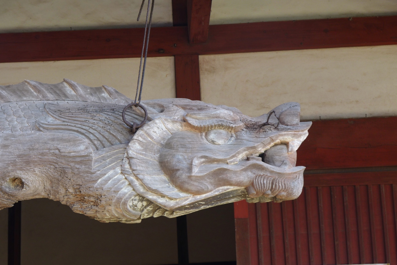 本堂脇の庫裡の入口には大きな木彫の魚が吊るされていました。これはお坊さんたちに食事の合図を知らせるために叩いたそうで、珍しい物だと思います。