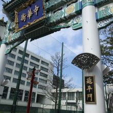 横浜中華街西側、さわやかな白い門柱が魅力的な門です。