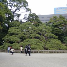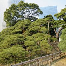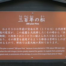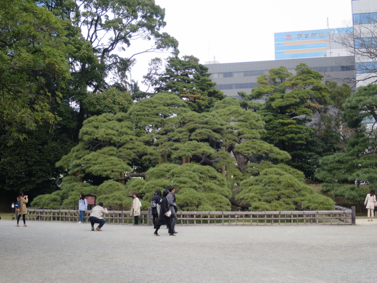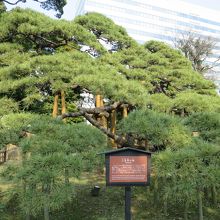 浜離宮恩賜庭園の大手門口を入ってすぐ左手に三百年の松がある。1709年に六代将軍家宣が庭園を大改修した際に植えられたと言われる黒松の巨木です。前からみると襖絵の様な針状の葉がこんもりと茂ってますが、横に回り込んで見ると太い幹が堤から前にせり出すように伸びているのが良く分かります。浜離宮の中で一番の見ものではないでしょうか?