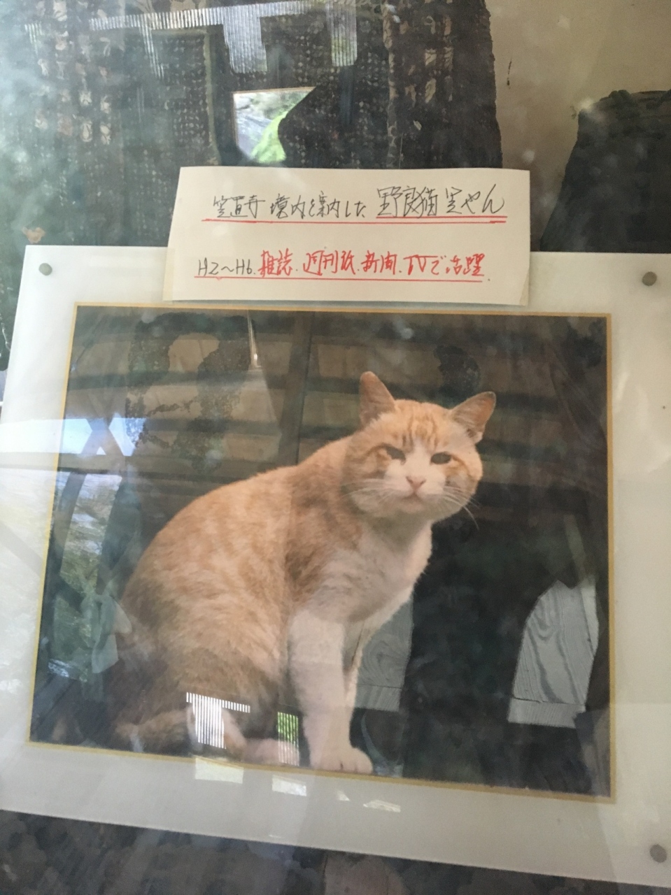 笠置山の山頂付近に磨崖仏で有名な笠置寺があります。笠置寺の境内に入って行くと、本尊の弥勒磨崖仏の横に正月堂がありますが、その中に、一枚のネコの写真がありました。かって、笠置寺に住み着き、観光客を案内し、週刊誌や新聞で話題になった野良猫の写真です。かさやんと言われ、笠置のゆるキャラ、かさやんの元となった猫です。