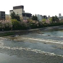 鴨川にかかる橋で、川沿いに咲く桜や、