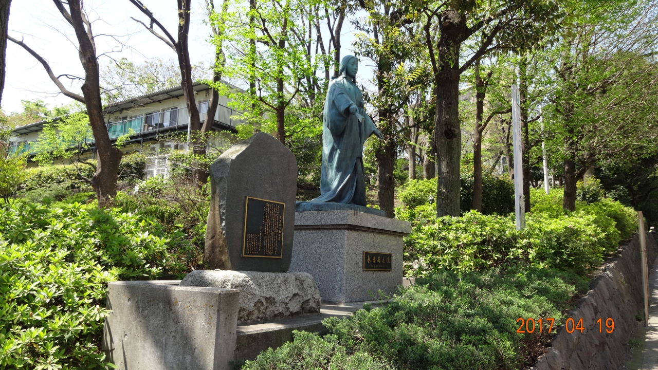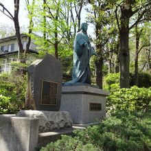 公園の入口に、凛とした雰囲気で和服姿の美しい女性の像が立っています!