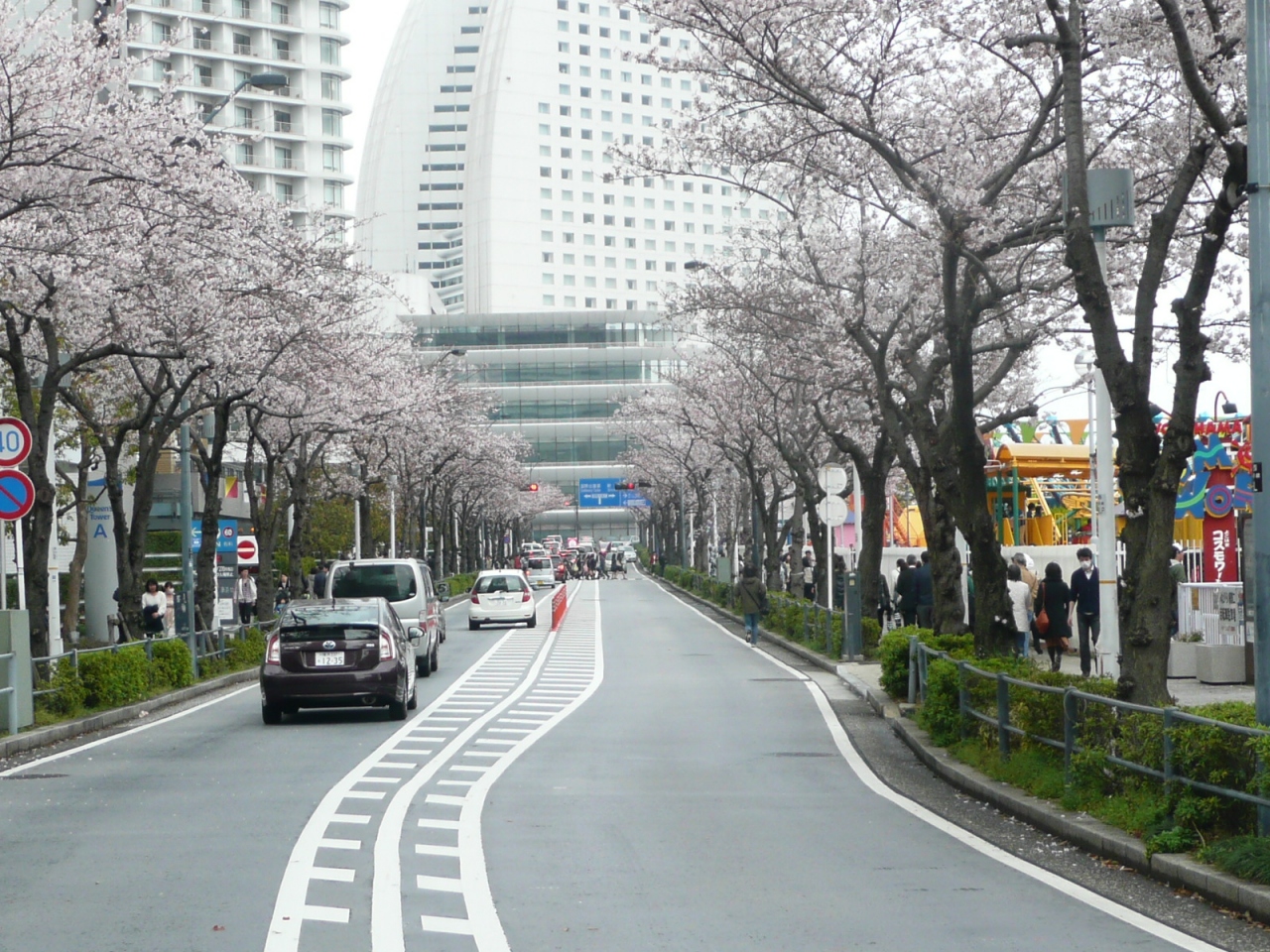この桜通りは、ランドマークタワーなどの近代的高僧ビル群と大岡川の河口に挟まれた道路です。休日の午後、桜木町に映画を見に出かけたついでにこの通りを訪れました。近代的ビルを背景に満開の桜が並ぶ光景に、見事な美しさを感じました。