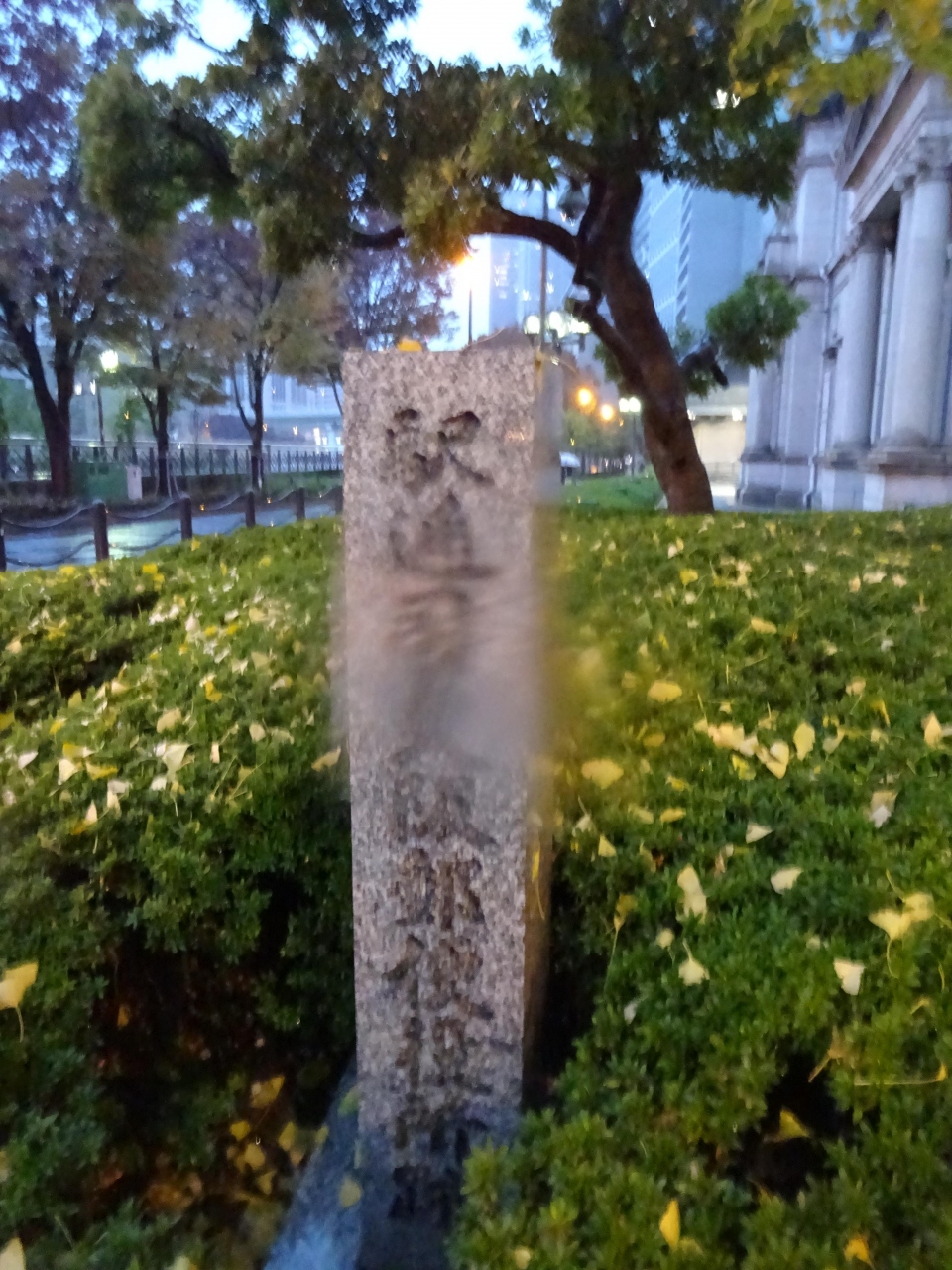 日本銀行の前、ツツジの植え込みの中に跡地を示す石柱がおかれています。