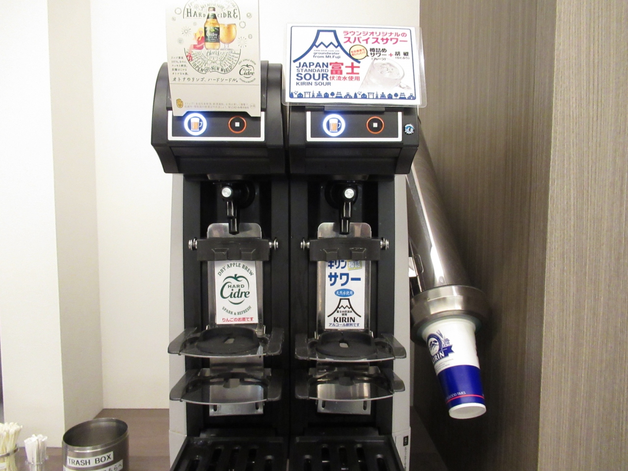 入口には鍵付きの荷物置き場、ドリンクコーナーには生ビールに加え、シードルやサワーのサーバーが設置されていました。そしてスナックには大阪名物おこしも。