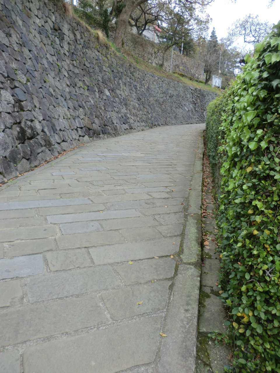 大浦天主堂から歩きました。15分程度かかったと思います。活水女学院を左手に見ながら上って行きます。文字通り、急な坂を「登り」ます。自転車では無理です。坂を下るのも、危険すぎてやめた方がいいです。明治時代、西洋人がこのあたりに住んでいたようで、その人たちのことを「オランダ」といったそうです。健脚な方にはお勧めですが、中高年の方は避けた方がよいと思います。車椅子は絶対無理です。