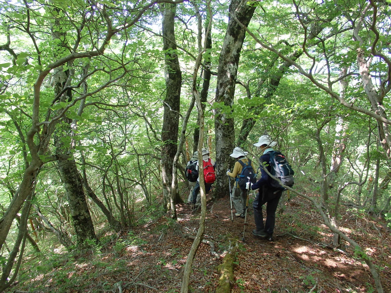 タニウツギ、ウツギ、ガマズミ、ミツバツツジの花が見られる割りと急な土が掘られた木段を登る。歩きにくい。展望台からは雲がかかった富士山がくっきり見える。山に登り、富士山がきれいに見えると、心が癒される。山頂近くになって淡いピンク色をした愛鷹ツツジにお目にかかれるようになる。最盛期は過ぎているようであるがすばらしい光景である。山頂で地元ハイカーより、地元ハイカーしか通らない(案内書や地図に記載されていないルート、炭焼き道と言う)道を紹介され、そのハイカーに案内して頂いて下る。割りと急下りであるが土の道なので歩き易い、ブナ等緑がきれいな道を下る。これぞ山登りの醍醐味を味わう。本日のコースは標高差が約620Mであるが、急登りあり、掘れた木段、山道があり、登りは良いが下りは苦労すると思われたが、地元ハイカーのご好意により、歩き易いみちをくだれて幸いでした。感謝します。