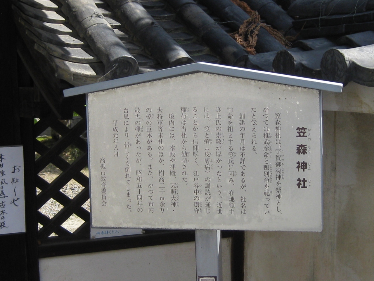 高槻駅から西方芥川沿い西真上にある神社。創建は不詳、名前は稚武彦命、鴨別命を祖先とする笠氏にちなみ、この地の領主真上氏の崇敬が厚かったそうです。この神社は江戸時代には笠森稲荷と呼ばれ瘡(かさ梅毒)の治療の霊験があるとされ多くの人の信仰を集め、江戸小石川に勘定されたそうです。このように由緒ある神社で緑ヶ丘病院の近くにあるのも何かの縁でしょうか。住宅地の中に門構えがしっかりと、庭の樹木も茂っています。
