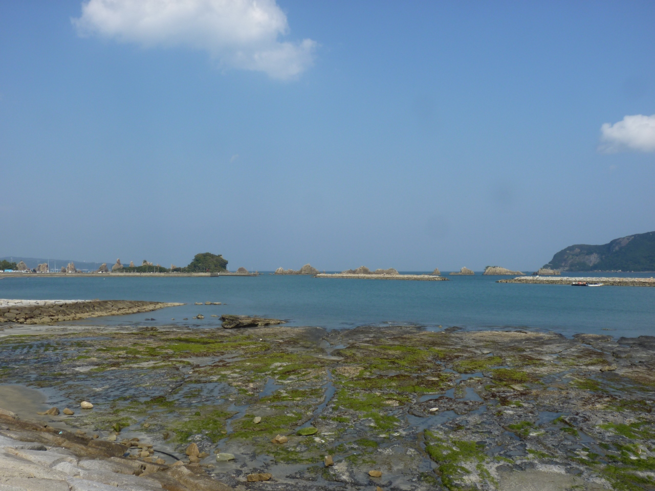 潮岬より南下し暫く進むと標札が見える。「橋杭岩」と云う奇岩群が海の上に15~6本そそり立つように立っている。手前の公園の駐車場に車を止めてその全景を眺めることが出来た。ここからは全ての奇岩が眺められた。近くまで行くと目の前で見ることも出来る。