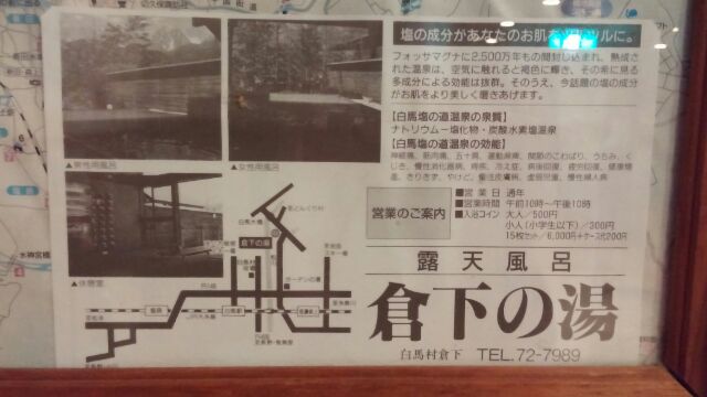 お湯は茶色で塩味がします。雪の季節でなければ、露天風呂からは美しい眺めが見えるのでしょうが、大雪のため横も上も全て囲われていて、内風呂のようになっていました。2階には無料休憩所があります。雪の降る中温泉に入りほっこりとさせていただきました。