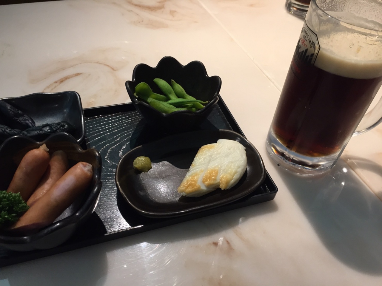 仙台を離れる前に名残惜しくビールを一杯。空港のビールは、その土地を離れる寂しさと帰る安堵感が合い混じります。空港は、高いイメージがありますが、ここは良心的で安い晩酌セットのようなものがありました。さっそく、それを注文。食事は仙台市内ですませてきたので、これで十分。飛行機の時間までここでビールをいただき帰路につきます。