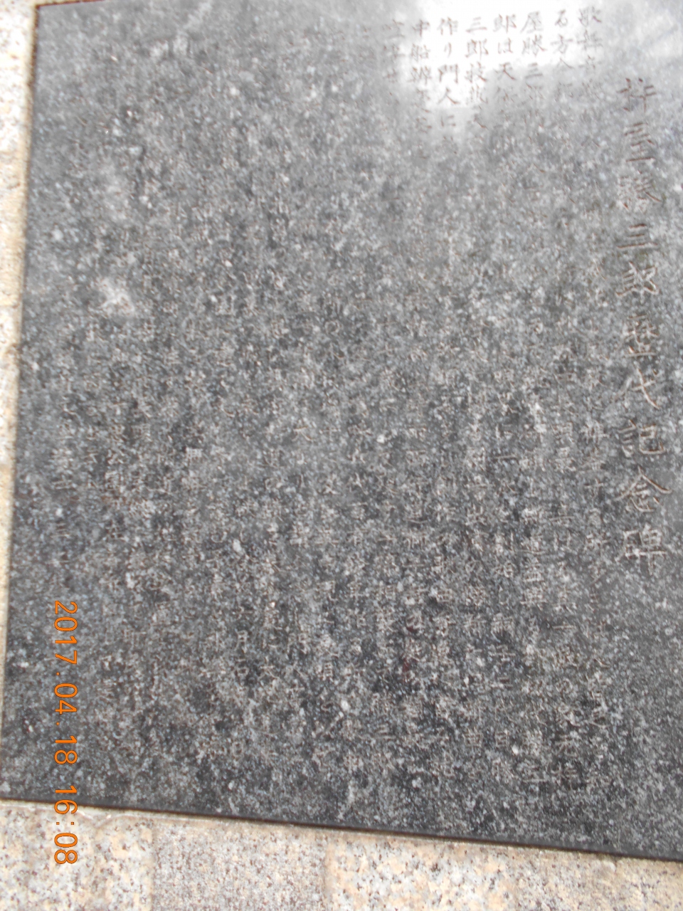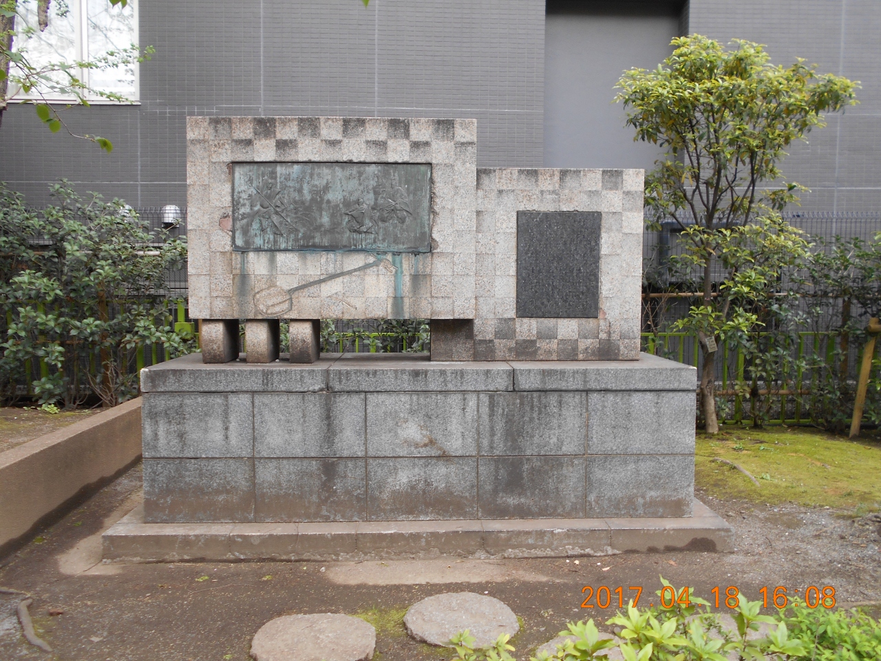 杵屋は長唄三味線の家名で 現在活躍中の杵屋勝三郎は八代目で2010年に襲名披露公演をしており 小伝馬町駅に近い十思公園内に 杵屋勝三郎歴代の記念碑が建てられていて レリーフの表面は緑青がうき出ていて絵が描かれている横に 小さな石の説明板もあります。