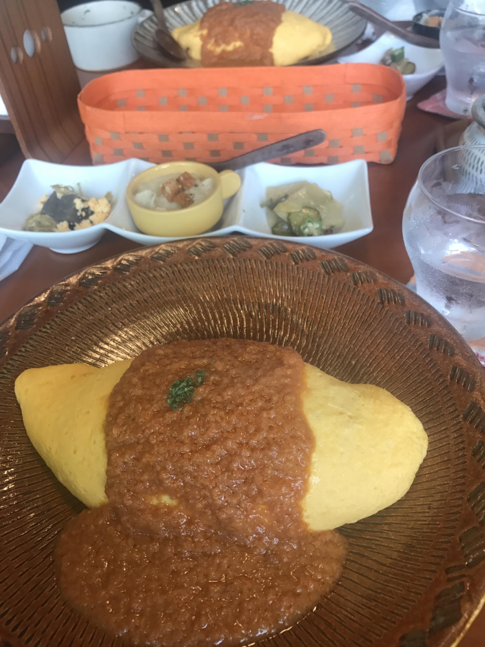 モーニングも評判のお店ですが、今回はランチに訪問。オムライスかキーマカレーの2種類でお惣菜3種類と具沢山お味噌汁、ドリンクげついています。オムライスは見た目はしっかりした形をしてるのですが、ふわふわで和風のミンチソースもおいしく、最後までおいしくいただきました。