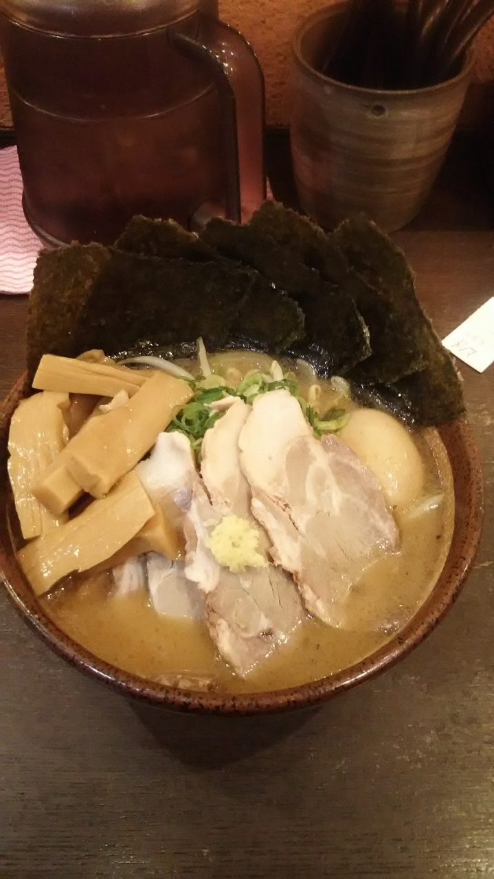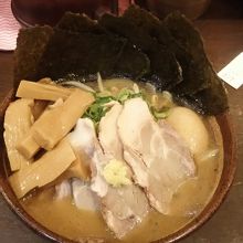 炙り味噌のスープは、確かに炙ったような香ばしさを確かに感じます。中太のちぢれた麺がこのスープによくマッチしています。全体に濃い味なので、チャーシューに乗っけてある生姜がさっぱりさせることでいいアクセントになります。