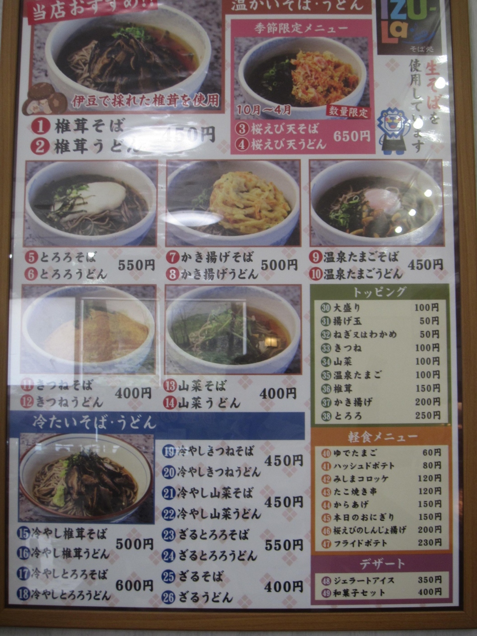 修善寺駅が新しくなる前にもそば屋がありましたが、駅がリニューアルされてからも駅構内のお土産屋「イズーラ」の中にお蕎麦屋を中心としたスナックコーナーがありました。お店の一番のおすすめは伊豆で採れた椎茸が入った「椎茸そば」だそうです。同じ伊豆箱根系列で運営している三島駅構内にあるお蕎麦屋さんにも同じく椎茸そばがありましたが、そちらの方がちょっと安かったように思います。椎茸とネギがトッピングされていて、椎茸は結構たっぷり入っていて結構美味しかったですよ。
